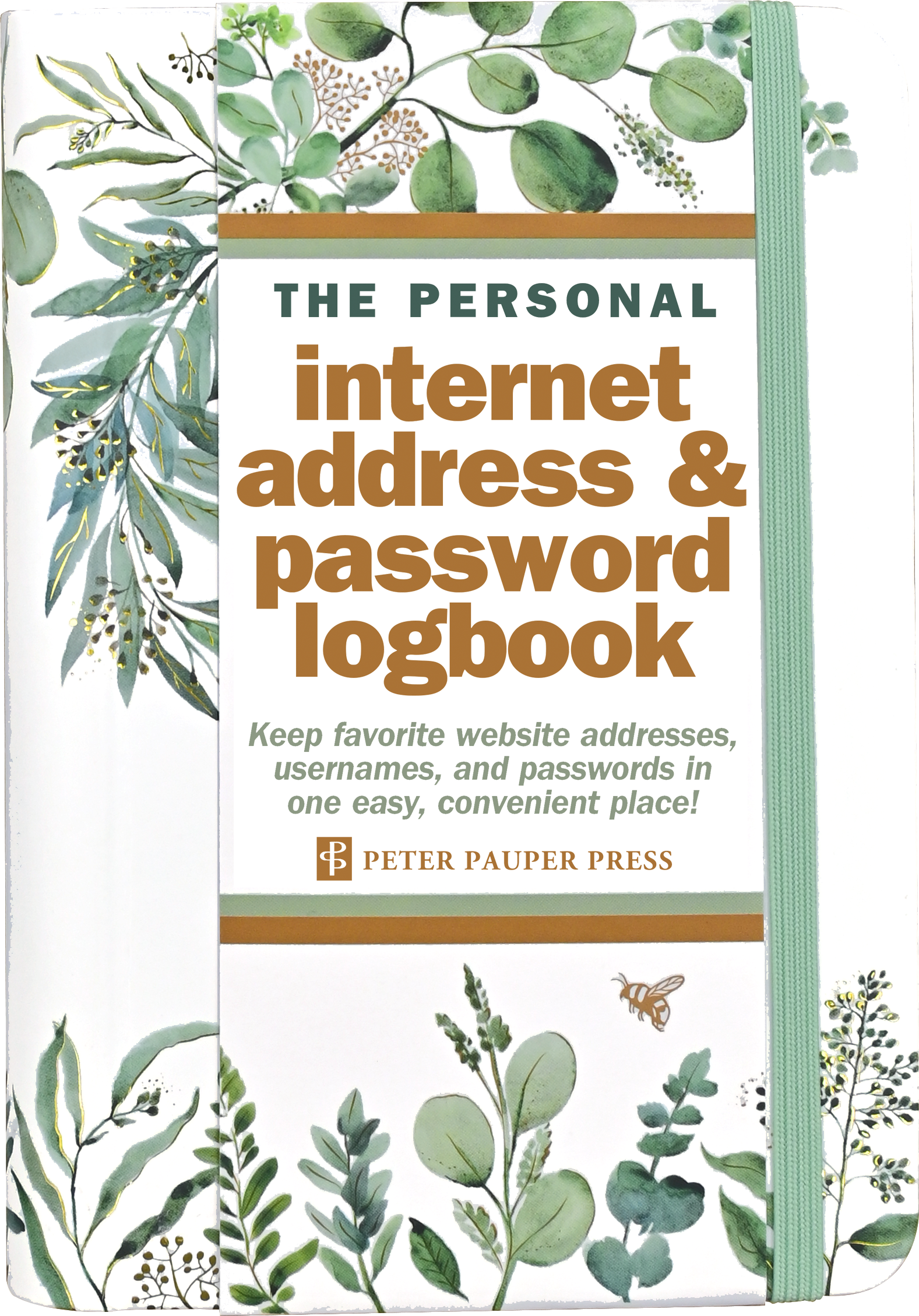 Tired of losing track of the websites you visit, along with their usernames and passwords? Now you can keep them all in one convenient place! This time- and headache-saving little volume is organized with tabbed A to Z pages, with space on each page to write down websites, usernames, passwords, and extra information. You'll also find pages in the back to make notes about home network configurations, software license numbers, etc. Removable cover band / label keeps logbook discreet. Matching elastic closure keeps your place or keeps logbook closed. Our Eucalyptus design features fresh watercolor greenery and a honeybee in flight, and is embossed and embellished with gold foil. Logbook makes an attractive and practical accessory for home or office. Concealed wire-o binding. Logbook measures 4-1/4'' wide x 5-3/4'' high. 144 pages. Matches Peter Pauper Press's other Eucalyptus gifts