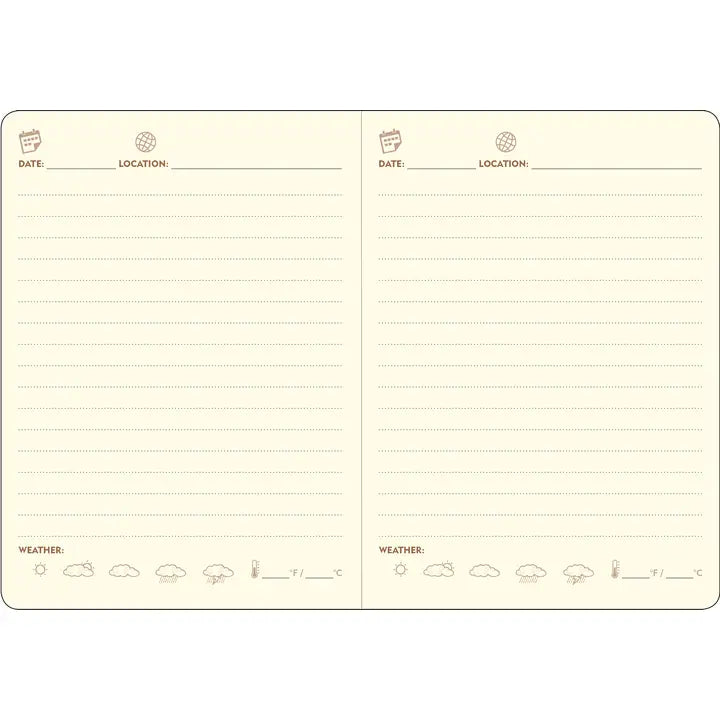 Record your adventures! A page a day is just enough space to take note of the places you've visited and explored. Compact travel journal provides 176 crisp writing pages. Use each page to record the Location, Date, Weather, and your travel notes. Premium 120 gsm paper takes pen or pencil beautifully. Paper is acid free and of archival quality. Dotted gray lines subtly guide your writing. A ribbon bookmark keeps your place. The inside back cover pocket expands to hold notes, travel mementos, and more. A matching elastic closure secures your journal. Cover embossing adds texture and dimension. Complementary interior endpapers. Sturdy bookbound vegan leather journal. Rounded cover corners for reduced wear. Journal measures 5'' wide x 7'' high. Compact size fits easily into most ba